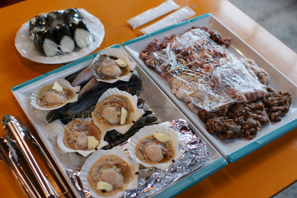 晚餐便在民宿旁 BBQ!(訂房時選擇每個人多加 500円) 食材相當豐盛,份量很夠;但是其中有一樣食材-腸子-就不免讓人想要抱怨一下了。或許是日本人不太常食用內臟類的食材,腸子不像台灣多先稍為處理過,結果烤起來一整個比橡皮筋還有彈性 (而且咬不斷)!
