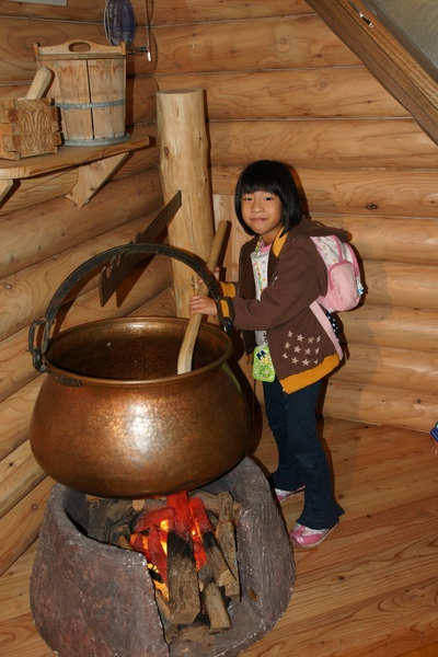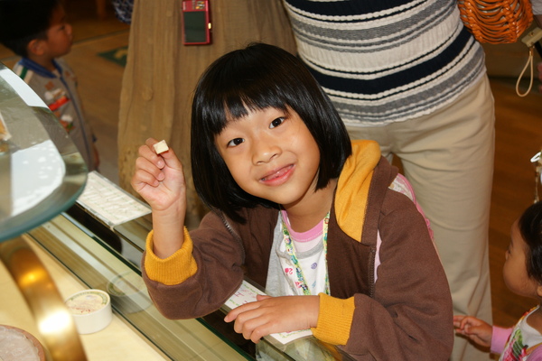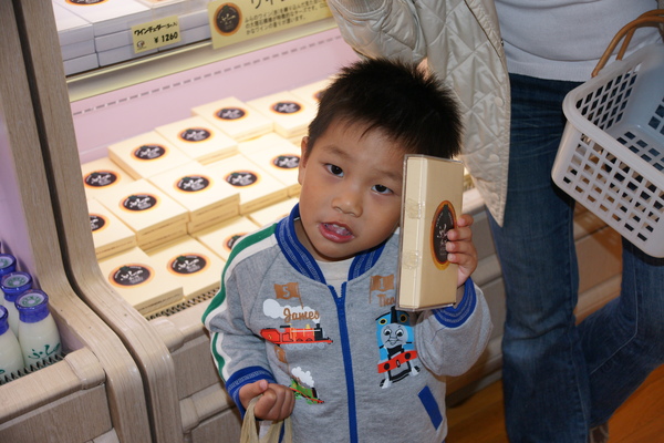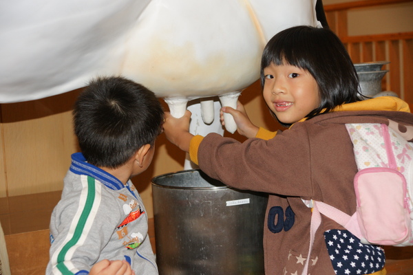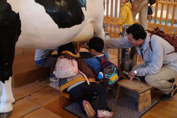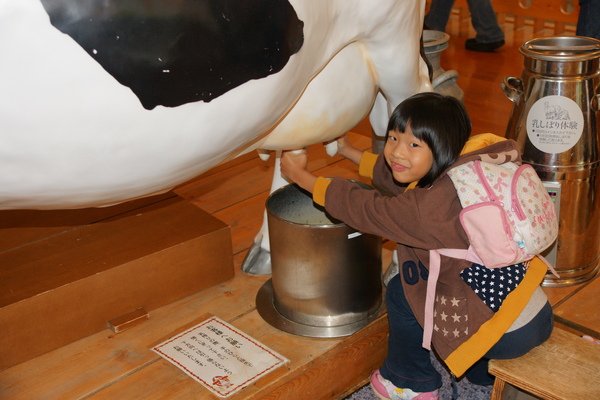 二樓還擺放了一台與真實乳牛大小相同的模型,有趣的是投下 100円還可以體驗擠牛奶 (擠出來的液體應該是水) 九十秒,李大哥還投了一次給三個小朋友擠牛奶,真有趣!