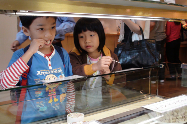 自由試吃當然也是重點!試吃的品項提供了三、四種,而且各切了一大盤放在冷藏櫃裡讓人自由取用,兩位超愛起司的小朋友彷彿來到起司天堂,瘋狂的給他試吃~而要不是沒辦法把起司帶回來台灣,老婆大人還真想給他買個過癮~
