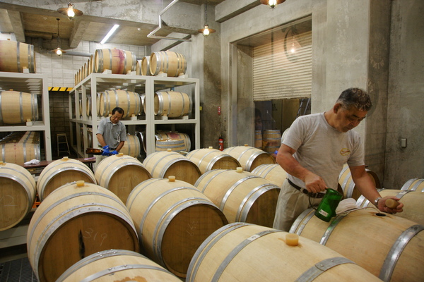 正在幫酒桶裡的葡萄酒加料的老師傅。