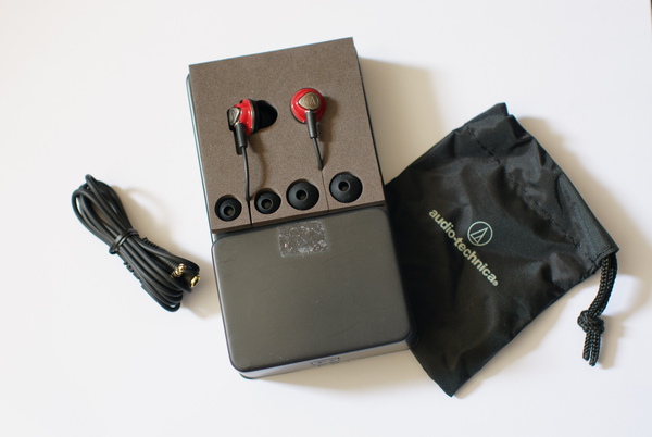 包裝頗為簡單,總共有三組不同尺寸的耳塞可替換,一條60公分的延長線 (本體線長只有60公分,也太短了吧?),還附上一個簡單的耳機袋~