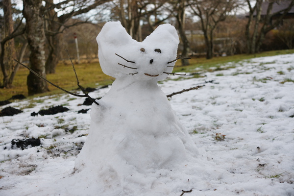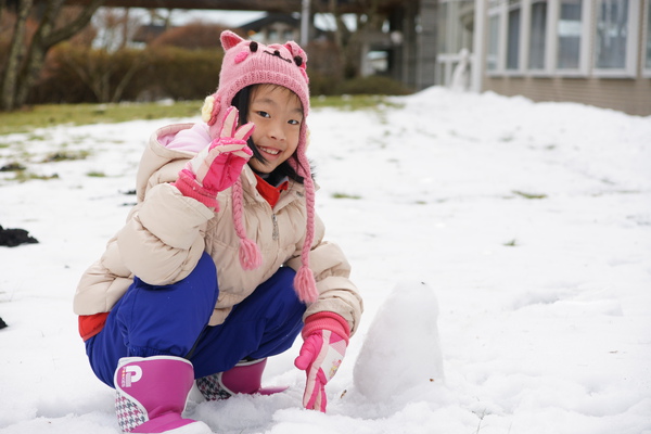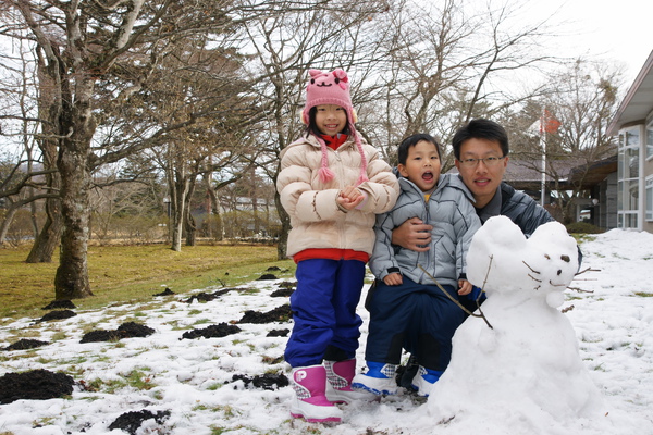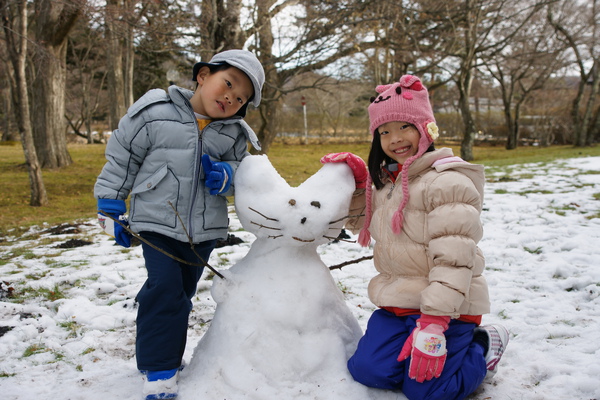 準備再堆個雪人留念,發現因為融雪的關係,雪質變得有點濕黏。這樣的雪意外的比剛來時的粉雪更好堆作雪人!