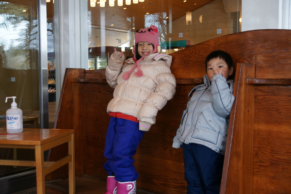 兩位小朋友靠著的架子,是在飯店門口放置滑雪用具的~
